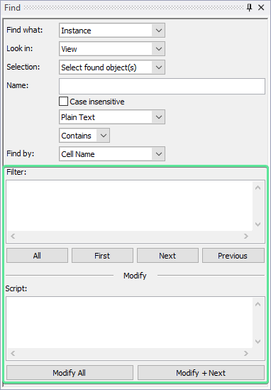 At the bottom of this window, there are two windows that read Tcl commands; The top field allows for advanced filtering and the bottom field allows for modification to matched cells using Tcl.